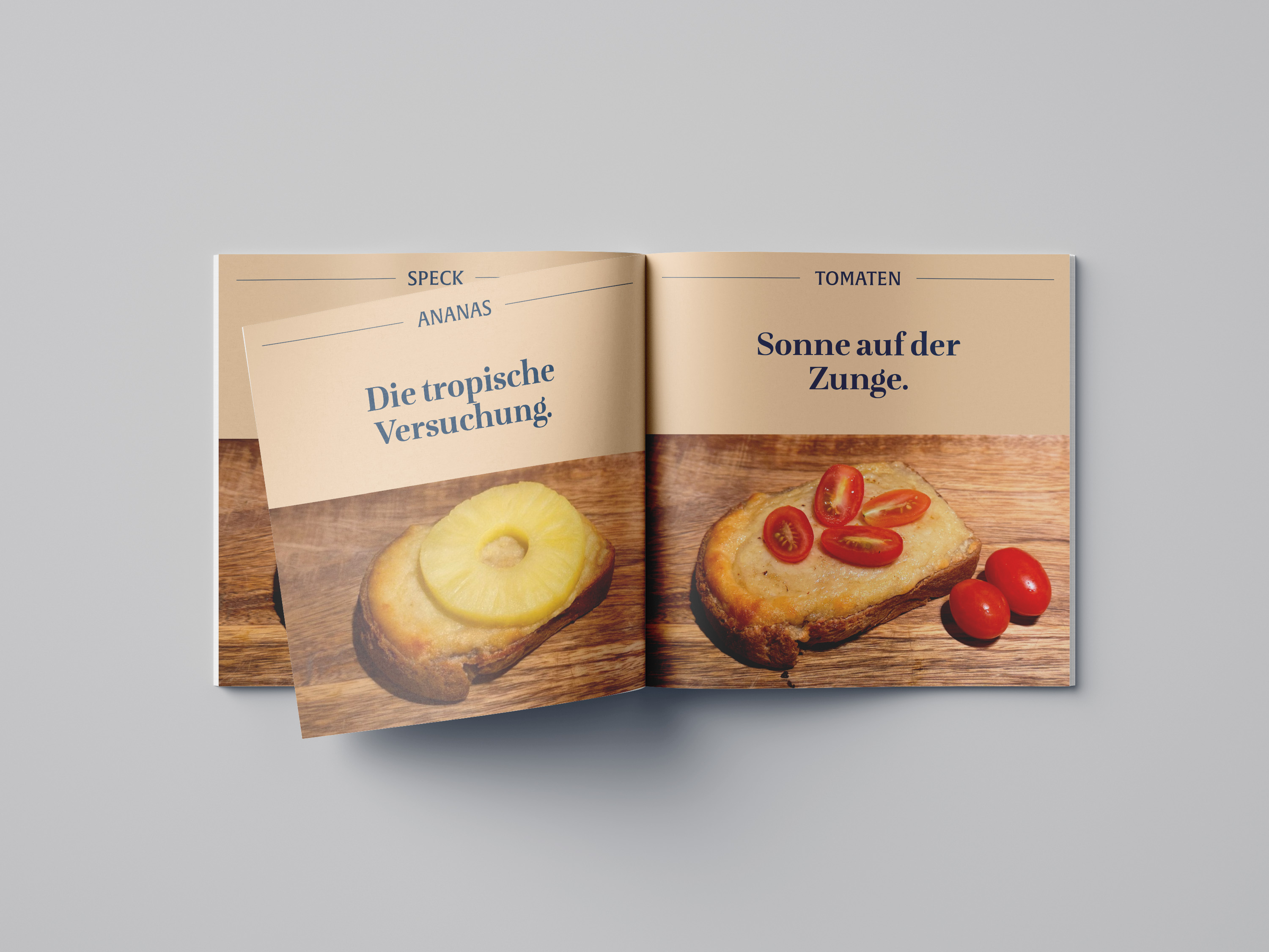 Im Mittelpunkt des Projekts stand die Idee, einem bekannten Klassiker frische Impulse zu verleihen. Entstanden ist ein hochwertig gestaltetes Booklet mit acht aussergewöhnlichen Topping-Rezepten, die zeigen, wie vielseitig, wandelbar und einfach unwiderstehlich eine Chässchnitte sein kann. Von würzig über exotisch bis hin zu richtig feurig – jedes Rezept bringt eine eigene Note und lädt zum Ausprobieren ein.
